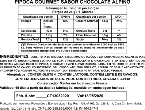 Nossos artesãos conseguiram o equilíbrio perfeito do irresistível sabor do Chocolate Alpino, em uma vitoriosa parceria com a Nestlé, aliando a crocância da PopCorn Gourmet ao inconfundível sabor do consagrado chocolate. (Contém Glúten e pode conter traços de trigo)